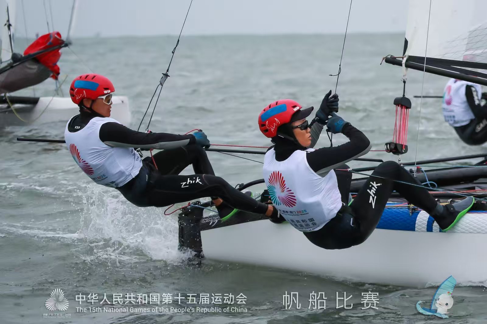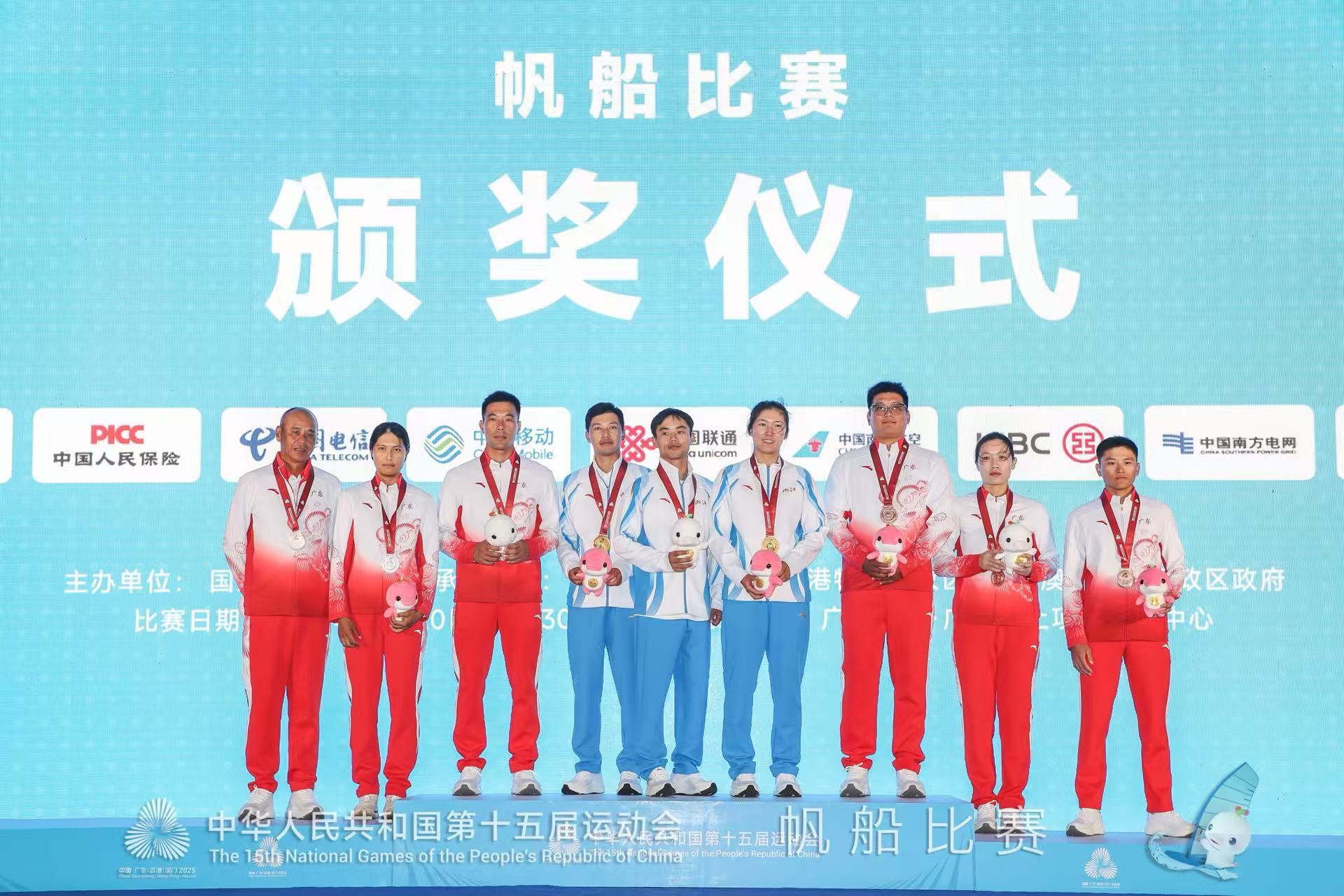 许华妹(右一)与队友在十五运帆船赛比赛中。受访者供图
