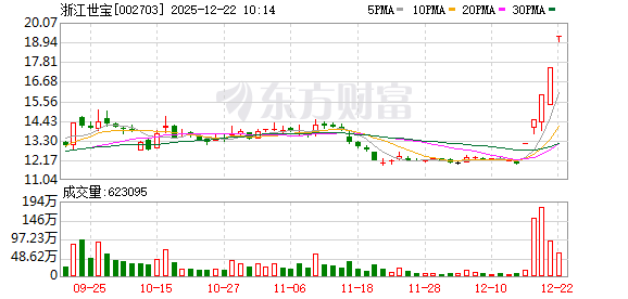 浙江世宝盘中涨停,已连收5个涨停板,截至9:25,该股报19.26元,换手率1.36%,成交量798.46万股,成交金额1.54亿元,涨停板封单金额为1.01亿元。连续涨停期间,该股累计上涨61.17%,累计换手率为76.61%。最新A股总市值达116.69亿元,A股流通市值112.87亿元。